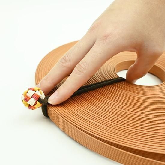 2.紙バンド中央の穴に『とめまる君』の玉を通し、紙バンドの切り口近くでゴムの輪をたまにかけます。
