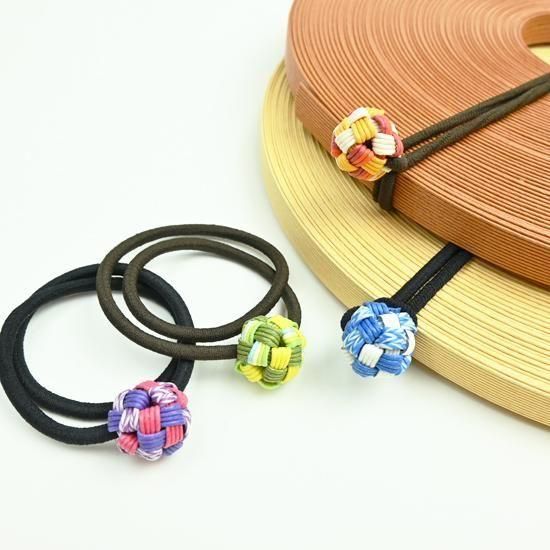 2.紙バンド中央の穴に『とめまる君』の玉を通し、紙バンドの切り口近くでゴムの輪をたまにかけます。